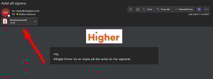 När avtalet är signerat får motparten en kopia i PDF skickad till sig.