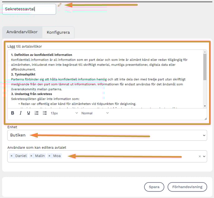 Längst upp till vänster kan du döpa om ditt avtal genom att trycka på pennan. Lägg sedan till användarvillkoren och den enhet som ska ha tillgång till avtalet samt vilka användare knutna till den enheten, som får möjlighet att redigera avtalet.