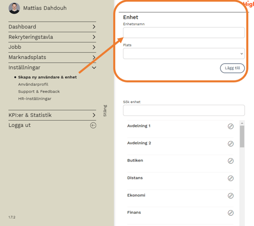 För att byta enhet på en användare behöver du redigera användaren och redigera det under "Ny användare".