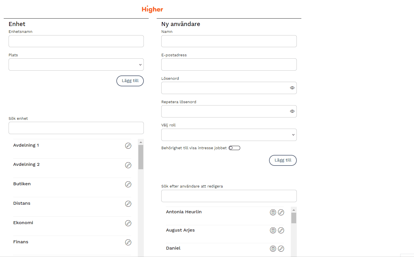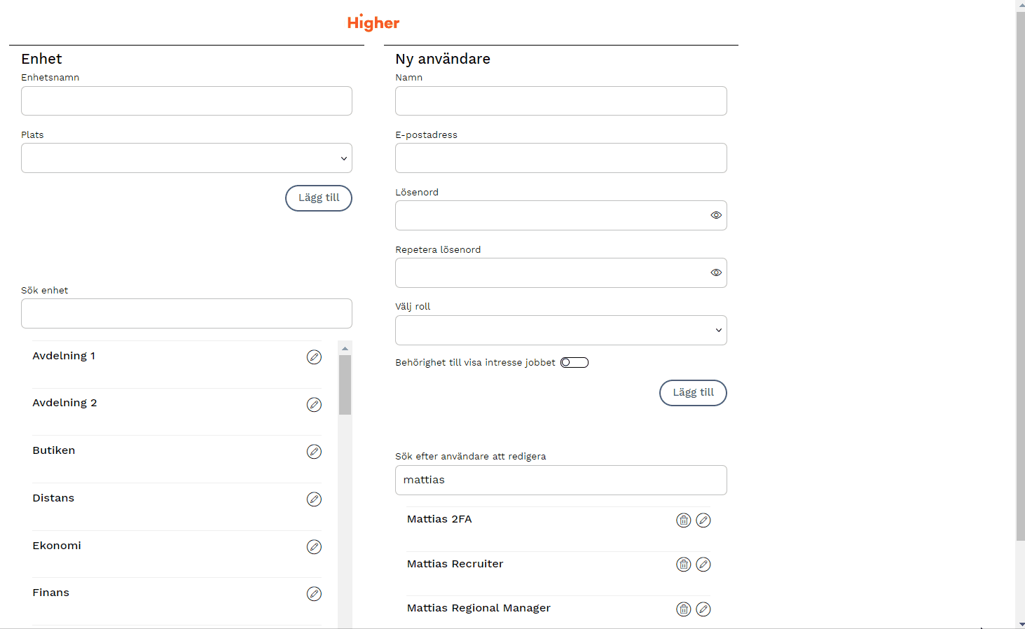 I Higher kan man skapa enheter. Enheter kan till exempel vara en avdelning, ett kostnadsställe eller en plats som olika användare ska ha behörighet till. En användare kan ha tillgång till en, flera eller alla enheter beroende på behörighet. Tänk på att jobbannonser som läggs ut också måste knytas till en enhet för att kunna publiceras på er karriärsida.