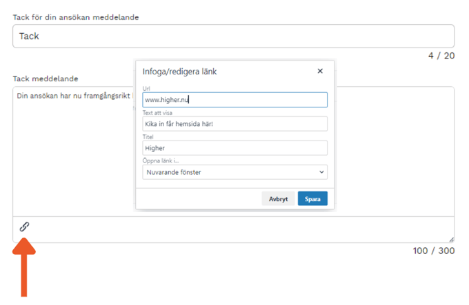 💡 Genom att trycka på hyperlänks-symbolen kan du infoga länkar i ditt tack för din ansökan-meddelande.