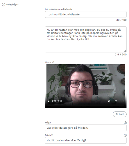 Du kan ställa upp till 3st frågor som kandidaten kan svara på i videoformat. Kandidaten kommer se frågan skriftligt och kan ge ett svar på högst 30 sekunder via video. Tänk på att inte ställa för komplexa frågor. Kandidaten har möjlighet att dölja sitt ansikte och göra om sin inspelning om de inte är nöjda.