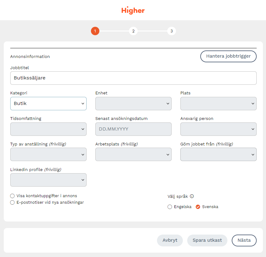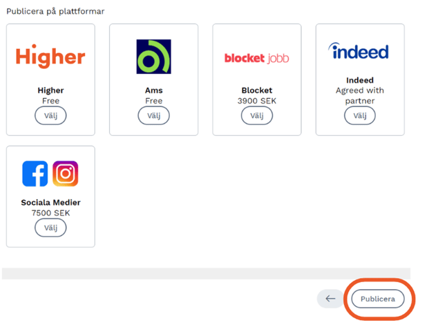 I denna vy ser du vilka plattformar som Higher erbjuder dig att publicera dina annonser på. Då detta är en jobbmall vi skapar och inte en jobbannons, behöver du inte välja något här. Det enda du behöver göra är att trycka på "Publicera" längst ned till höger för att spara din nya jobbmall.