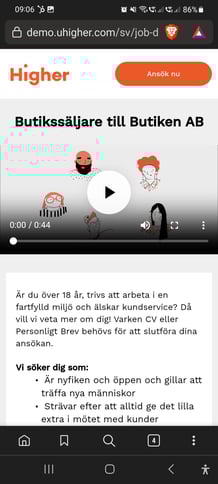 Genom att upplysa kandidaten i annonsen om att ansökningsprocessen sker med hjälp av video och att rekryteraren själv spelar in en videohälsning, ökar man antalet videokonverteringar från sina kandidater. Vi rekommenderar att ställa enkla frågor och opersonliga frågor som är kopplat till tjänsten.
