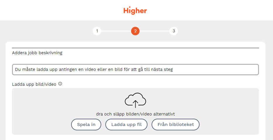 Börja med att ladda upp en bild eller video. Du kan välja att spela in direkt från din enhet, ladda upp filen från din enhet eller välja från biblioteket. Om du inte hittar någon media när du trycker på "Från biblioteket" beror det på att du inte har laddat upp något sen tidigare. All media du laddar upp i Higher kommer nämligen att sparas i mediebiblioteket så att du och resten av dina kollegor, kan återanvända det för framtida bruk.