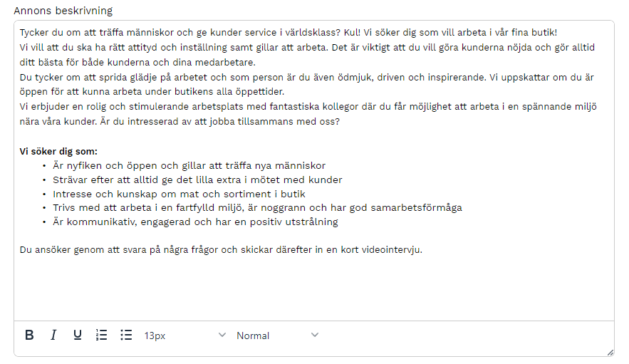 💡 TIPS för att göra annonsen mer lättläst och överskådlig för de kandidater som hittar jobbet via mobilen är det fördelaktigt att skriva punktlistor.