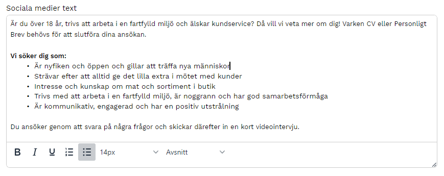 I rutan för sociala medier text kan du skriva en kortare sammanfattning om tjänsten. Här bör ni specificera de krav ni har på tjänsten i syfte att få kvalificerade konverteringar från de kandidater som hittar era tjänster via sociala medier.