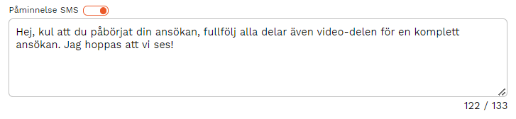 Genom att ha SMS-påminnelser aktiverade (orange = aktiverat), kommer Higher att skicka iväg system-SMS som påminner kandidater om att slutföra sin ansökan. Du kan själv bestämma vad som ska stå i detta SMS med en begränsning upp till 133 tecken.
