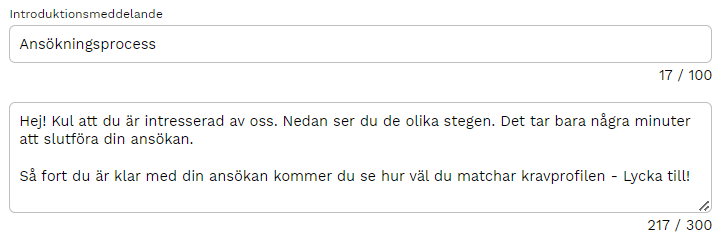 Detta förklarar och förhandsgranskar de moduler som ingår i ansökningsprocessen. Här kan man redigera och ändra texten utefter hur man vill att ansökningen ska presenteras inför kandidaten.