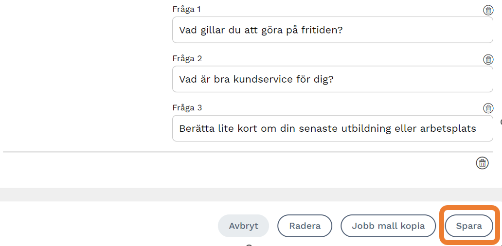 När du är nöjd med valet av moduler, frågor och videoinspelning är det dags att spara och publicera din jobbmall. Gå vidare i processen genom att trycka på "Spara"-knappen längst ned till höger.
