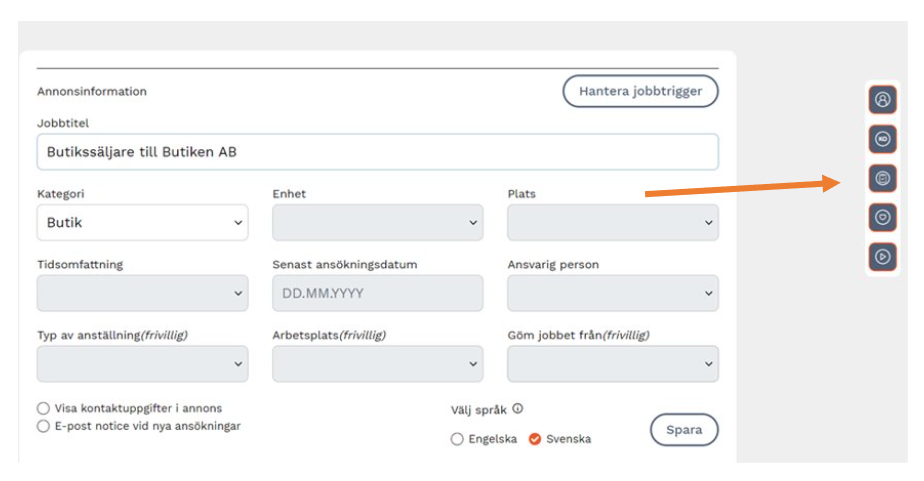Under annonsbeskrivning fyller du i en beskrivning av tjänsten, t.ex vilka krav det ställs på kandidaten, vilka kompetenser som efterfrågas och en arbetsbeskrivning.