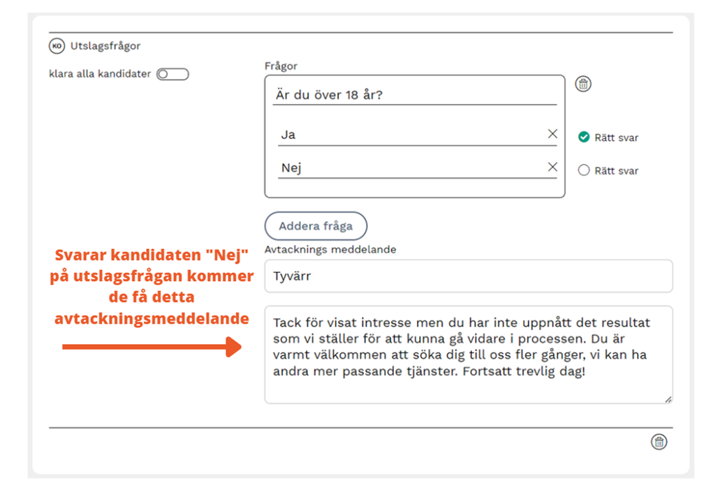 Om en kandidat svarar rätt på frågan går de vidare i ansökningsprocessen. Om en kandidat svarar fel på en utslagsfråga kommer kandidaten bli automatiskt avtackad direkt i systemet. Alltså är det viktigt att ni ställer bra och korrekta frågor som kandidater enkelt kan förstå.
