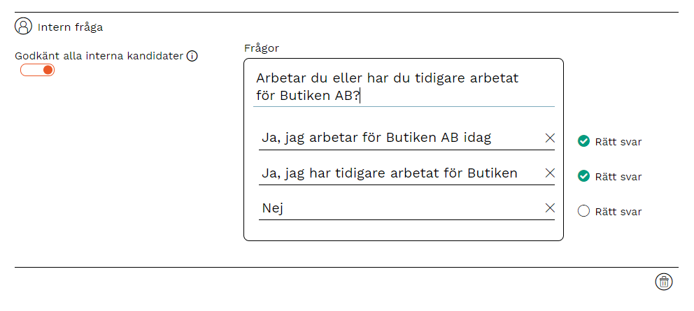 💡 Om du vill kartlägga de som har tidigare erfarenhet av att jobba inom er koncern, bolag, kedja etc. kan ni formulera frågan enligt ovan bild. På så vis kartlägger ni dem som redan är anställda hos er och vill byta roll, de kandidater som kanske jobbar inom samma bolag men på annan ort och dem som söker sig till er på nytt från en helt annan arbetsgivare.