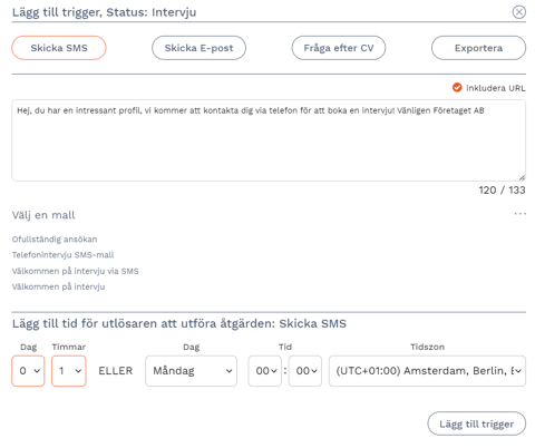 För att skapa en trigger för SMS-utskick väljer du "Skicka SMS" och precis som för "Skicka E-post", kan du välja att skriva texten själv eller använda dig av tidigare skapta mallar. Du kan också inkludera kandidatens ansökning genom att bocka för "Inkludera URL" och du kan lägga in en fördröjning innan SMS:et skickas iväg.