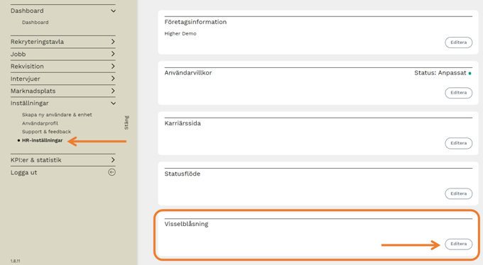 1. Gå till Meny > Inställningar > HR-inställningar > Visselblåsning - Editera