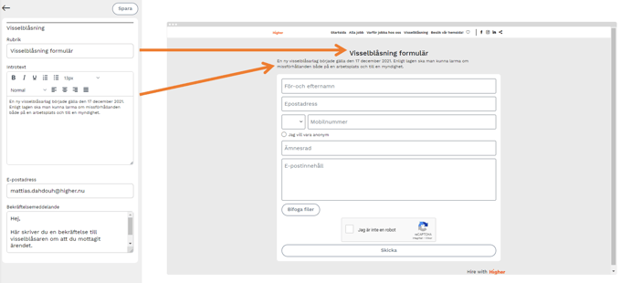 - E-postadress bestämmer vilken mejladress som ska ta emot visselblåsarens meddelande