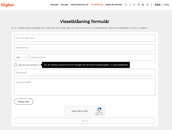 3. När du har sparat dina ändringar syns detta på karriärsidan där visselblåsaren kan larma vid missförhållanden etc. Visselblåsaren kan också välja att vara anonym, för att vara det måste personen bocka för alternativet. Man får också möjlighet att bifoga filer.
