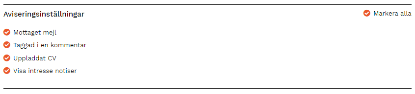 Här ställer du in om du vill ta emot aviseringar eller inte. Dessa aviseringar skickas till den e-post som din användare är registrerad med.