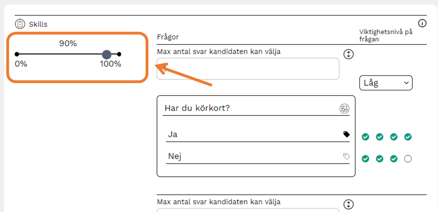 Automatisk avtackad-kolumnen i rekryteringstavlan är en systemfunktion och är till för att Higher ska kunna sortera bland de kandidater som inte uppnått önskvärd poäng i Skillsmodulen. I nedan exempel ser vi en annons med ett gränsvärde på 90%. Detta betyder att alla kandidater som får en poäng under 90% i Skills-delen, blir automatiskt avtackade i systemet.