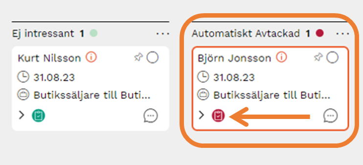 Från och med oktober 2023 kommer vi byta namn på kolumnen från "Automatiskt avtackad" till "Skills avtackning". Kolumnen kommer bli låst för redigering och alla kandidatkort som ligger kvar i den kolumnen efter denna förändring, kommer att förbli låsta där. Du kommer heller inte manuellt kunna placera kandidater där.