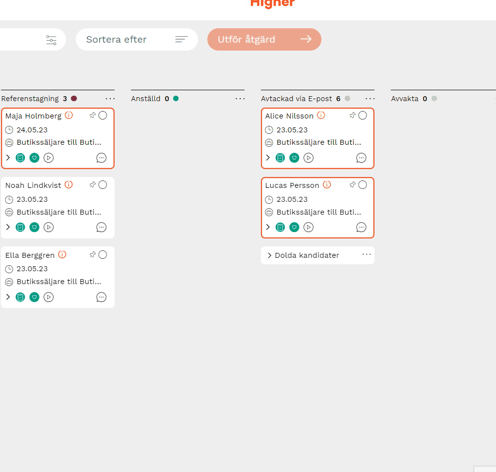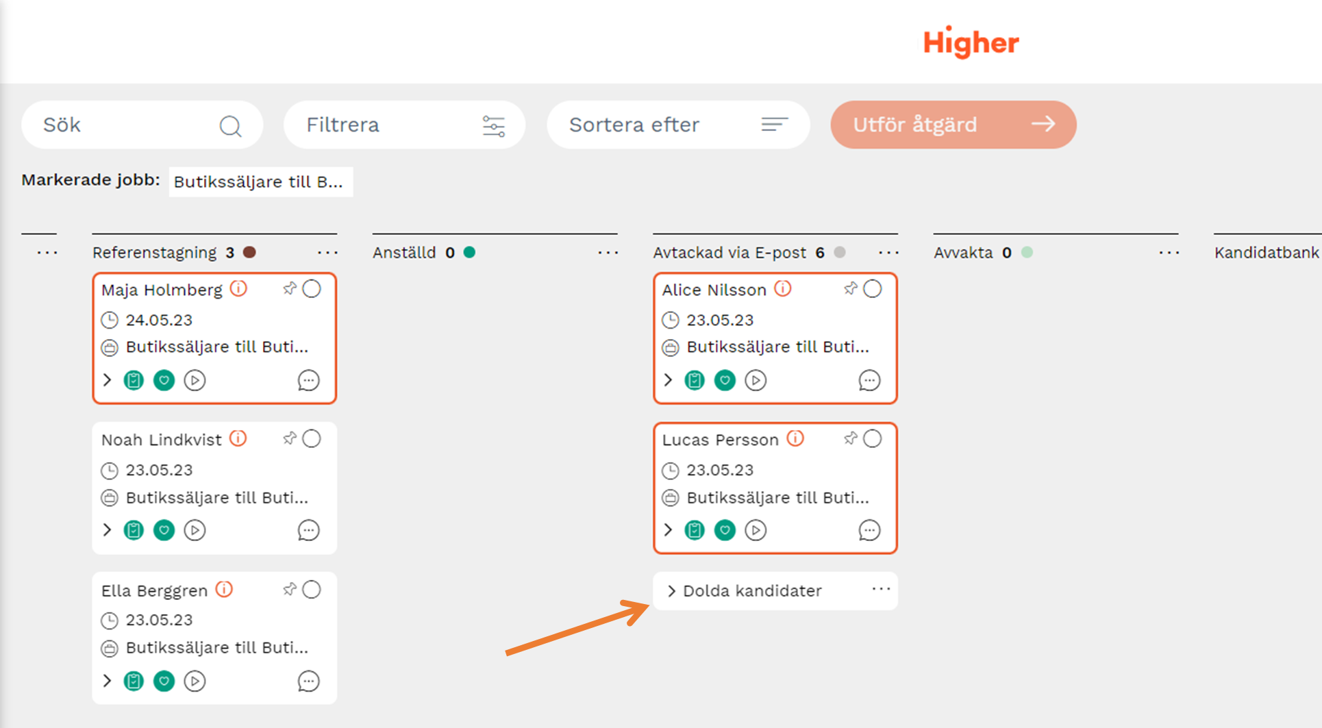 3. När du tryckt på "Dölj" kommer de kandidater du tidigare markerat, döljas bakom en grupp som heter "Dolda kandidater". Den lägger sig alltid längst ned bland kandidatkorten. Varje kolumn kan ha en grupp med dolda kandidater.