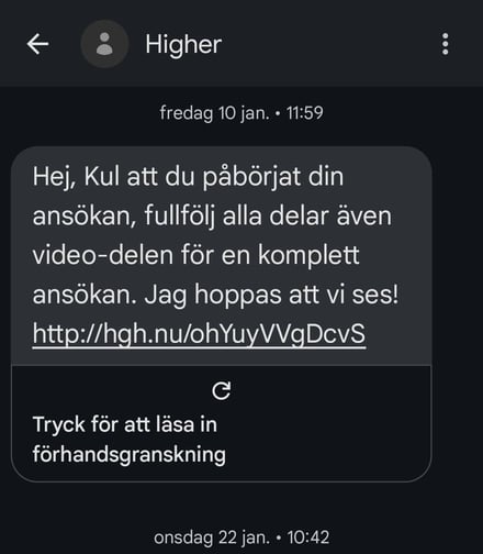 Om du har fått ett påminnelse-SMS till det telefonnummer du angav vid ansökan kan du enkelt fortsätta genom att klicka på länken i meddelandet.