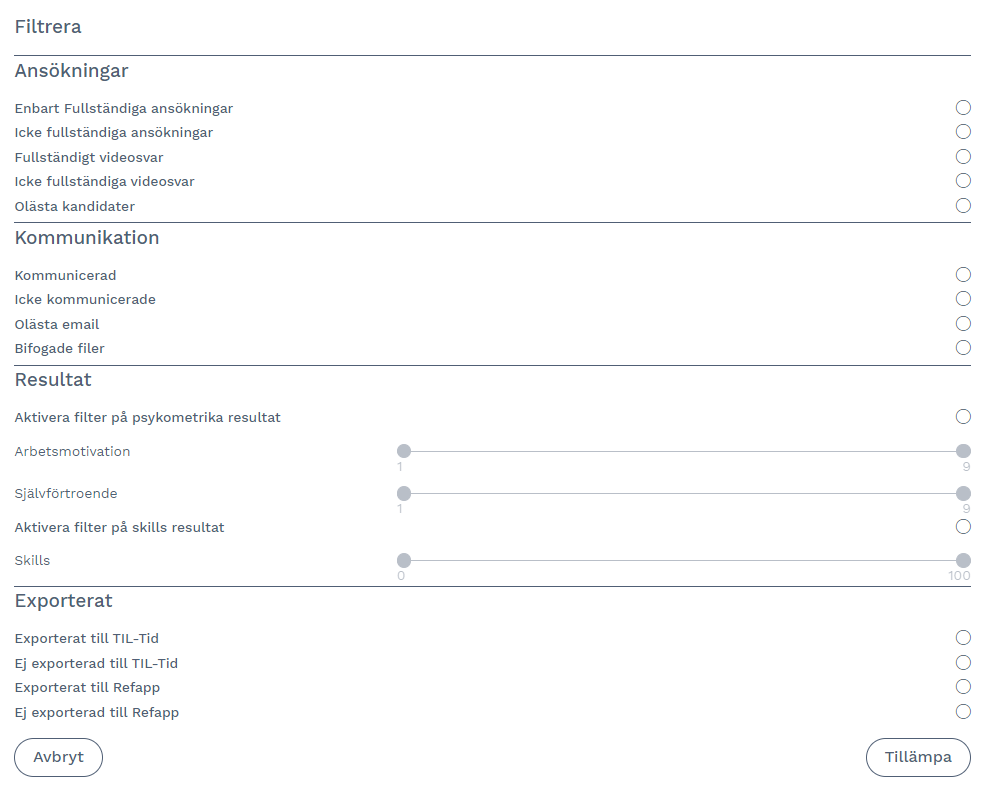 Har du RefApp och/eller koppling till TIL-Tid kan du filtrera fram kandidater baserat på om en export har gjorts eller inte.