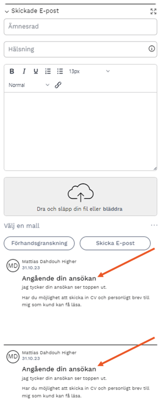 En e-posttråd är en samling av relaterade meddelanden som har samma ämnesrad. Alla svar mellan dig och kandidaten grupperas tillsammans i en och samma flik eller konversation, vilket gör det enkelt att följa hela dialogen i kronologisk ordning.