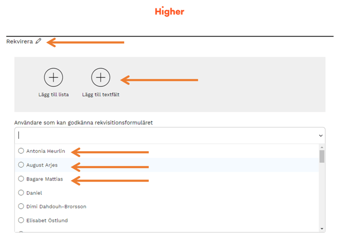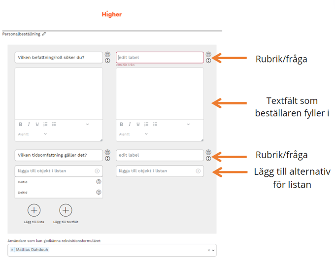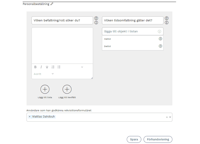 Nu behöver du ge formuläret ett namn, lägga till fält (textfält eller lista med alternativ) och bestämma vilka personer som ska ha möjlighet att godkänna rekvisitionsformuläret.