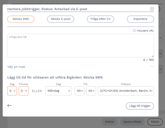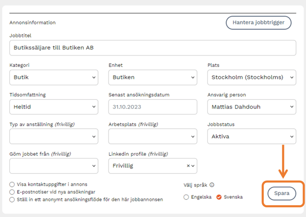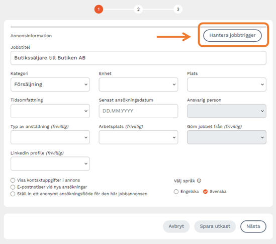 2. Tryck på Hantera jobbtrigger. Du kommer åt inställningen i samband med att du skapar eller editerar en jobbannons.