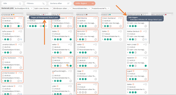5. I rekryteringstavlan kan du se vilka jobb som omfattas av trigger på företagsnivå eller är en jobbtrigger. I detta exempel syns flera jobb i rekryteringstavlan, inkl. ett jobb som har en jobbtrigger.