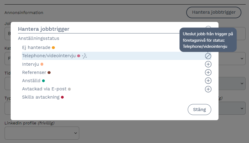 3. I denna meny kan du välja att utesluta jobbet från trigger på företagsnivå. Trycker jag på alternativet i detta exempel utesluts jobbet från att skicka en inbjudan till kandidat när denne placeras i kolumn "Telefon/videointervju"
