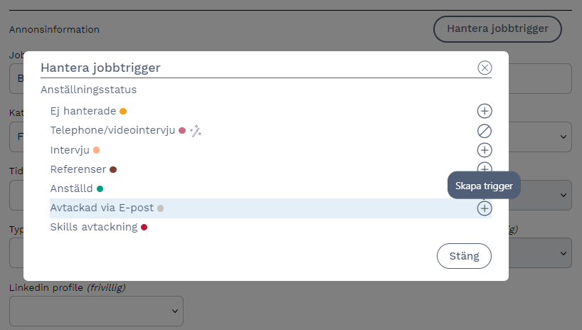 Genom att använda jobbtriggers kan du exkludera jobbannonser från den vanliga hanteringen av triggers. Detta är användbart när du till exempel vill anpassa kommunikationen för en specifik tjänst eller automatiskt begära ytterligare information från kandidater.