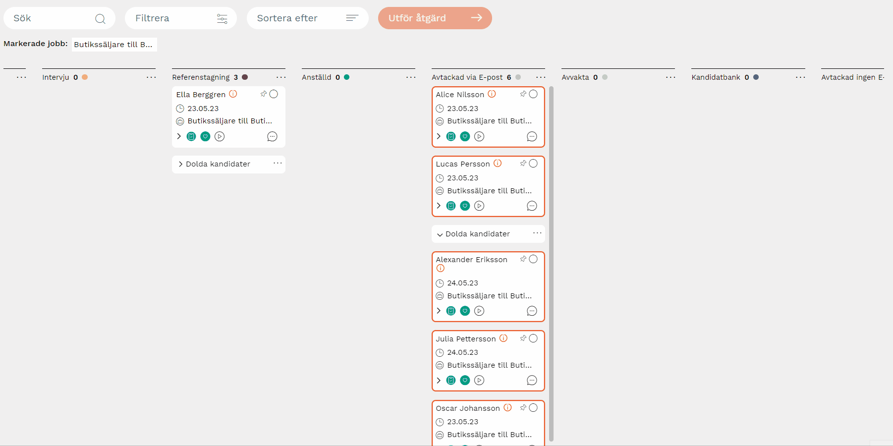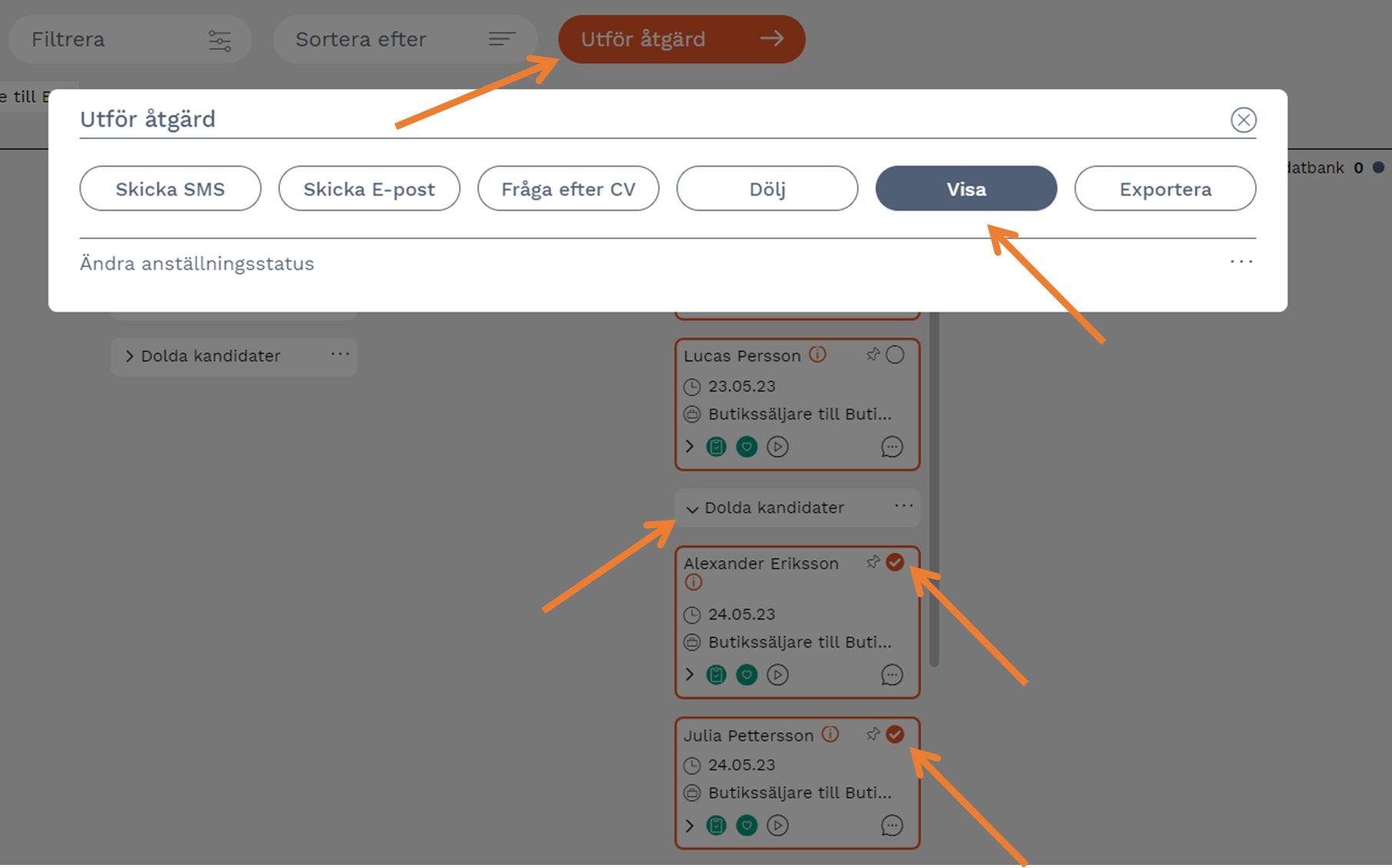 Markera de kandidatkort du vill visa, tryck på "Utför åtgärd" och därefter på "Visa". Om alla dolda kandidater markeras och visas, kommer gruppen "Dolda kandidater" att tas bort.